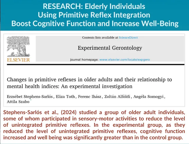 From the research above, we see that primitive reflexes can reemerge in cases of stroke and Parkinson's. Re-activated primitive reflexes are also commonly found in individuals with dementia (Altunkalem Seydi et al., 2024). And, promising research with elderly individuals showed gains in cognitive skills and well-being compared to controls after a 16-week sensory motor program for primitive reflex integration (Stephens-Sarlós et al., 2024).